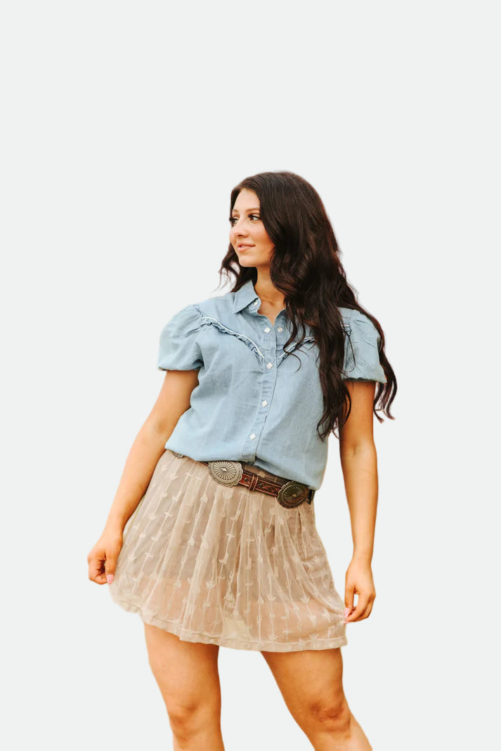 Add a playful western edge to your wardrobe with the Rowdy Ruffles Shirt from 2 Fly Co. Crafted in a soft chambray blend (55% cotton, 45% Tencel), this button-down top features charming ruffle accents along the sleeves and yoke, perfect for bringing show-ready flair to everyday styling.