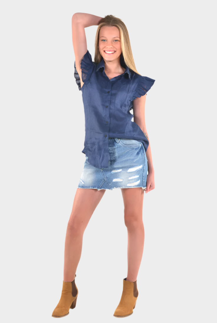 The Apley shirt is pure linen with cotton lace collar trims, semi fitted with beautiful ruffle sleeve trims