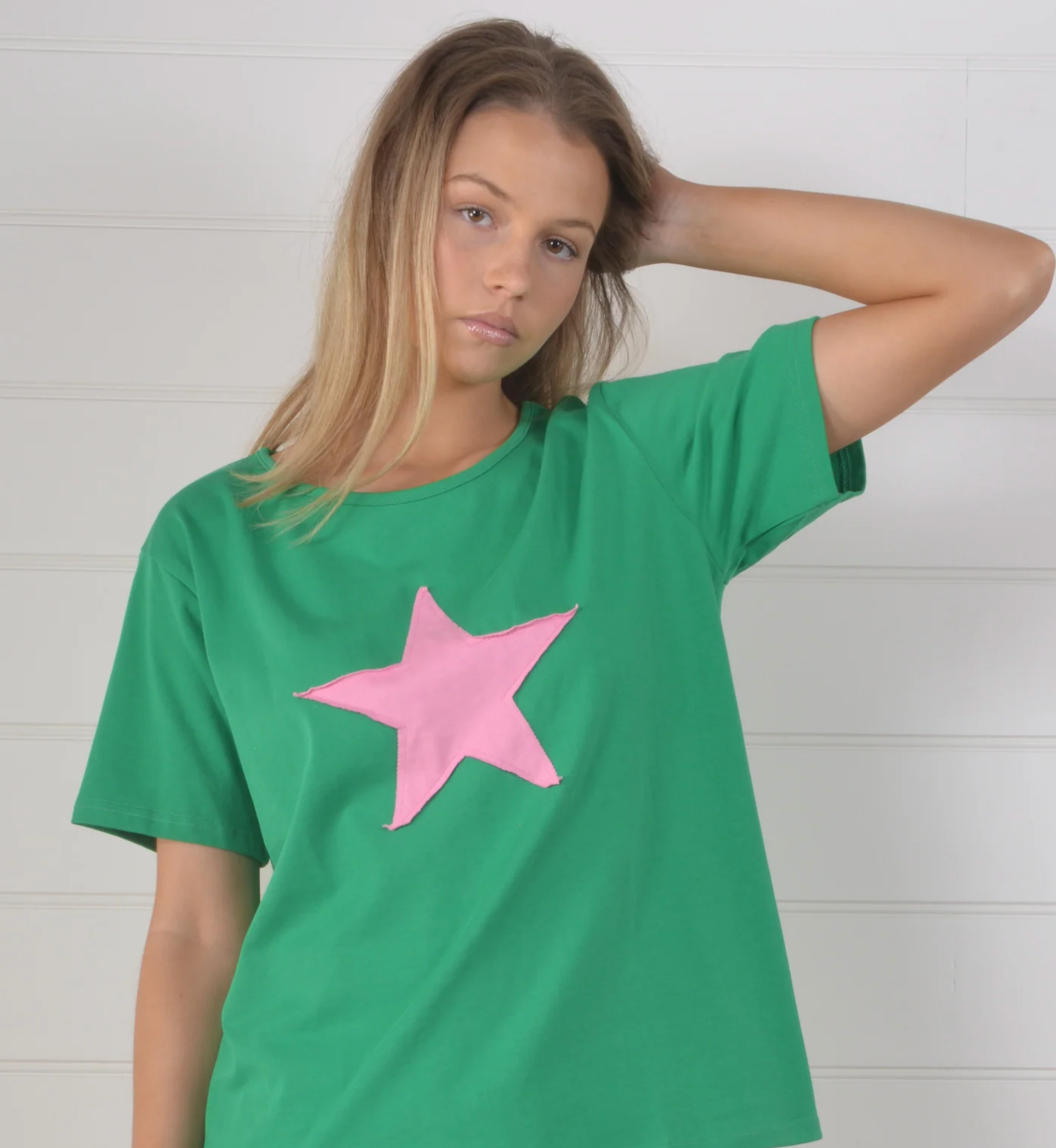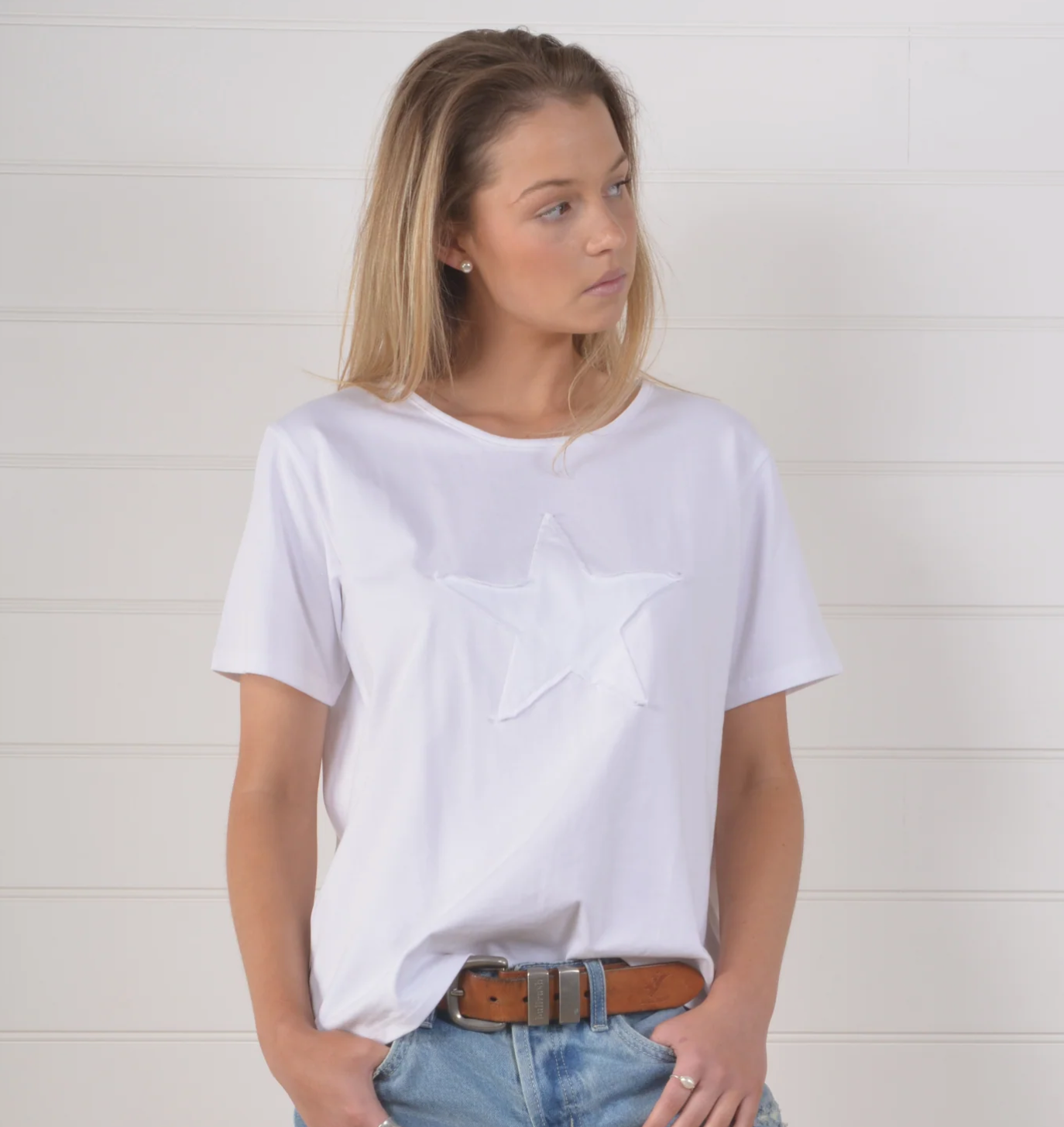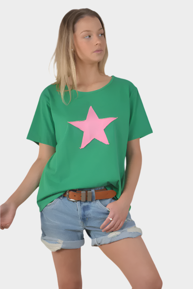 Refresh your summer wardrobe with our signature star tee. Aa perfect blend of comfort and style. This versatile tee boasts a classic crew neckline, short sleeves, and a playful vintage star. Its relaxed fit ideal for pairing with your favorite skirts, jeans, or lounge pants. Slip on sneakers to complete the look and elevate your off-duty style.