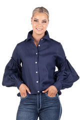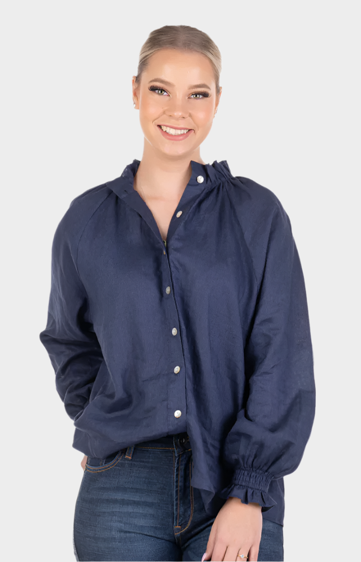 Classic and timeless, this navy linen gathered sleeve detail shirt is perfectly at home with tailored pants, jeans or a denim skirt. Easily transitioned from formal to casual, this shirt features beautiful gathering at the bicep and features a neat, tightly gathered 2 button cuff closure and shell buttons. New adjusted cuff circumference to allow easy closure. Looser fitting garment. Models wear XXS.