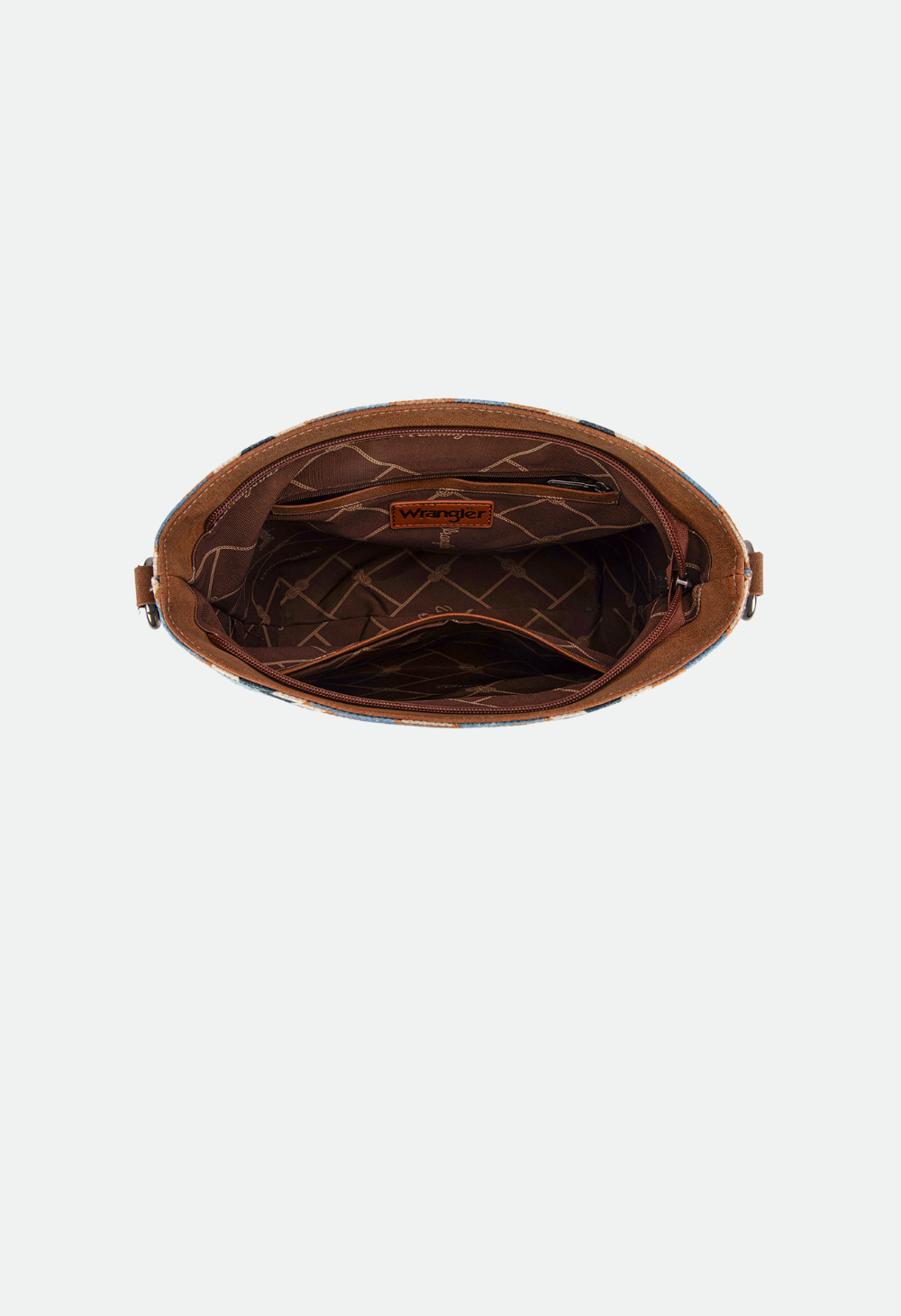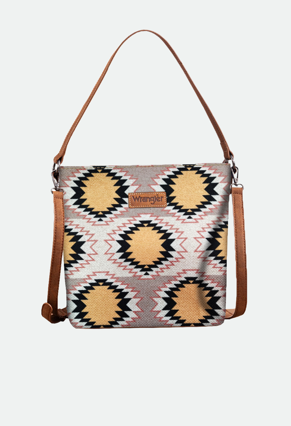 A stylish and practical canvas shoulder bag featuring a bold Aztec pattern, made from durable canvas with PU trim. It’s designed with a top zip closure, a back pocket with both zip and slip compartments, and an internal zip pocket. The bag includes a detachable, adjustable crossbody strap plus a carry handle, and is finished off with the iconic Wrangler logo badge.