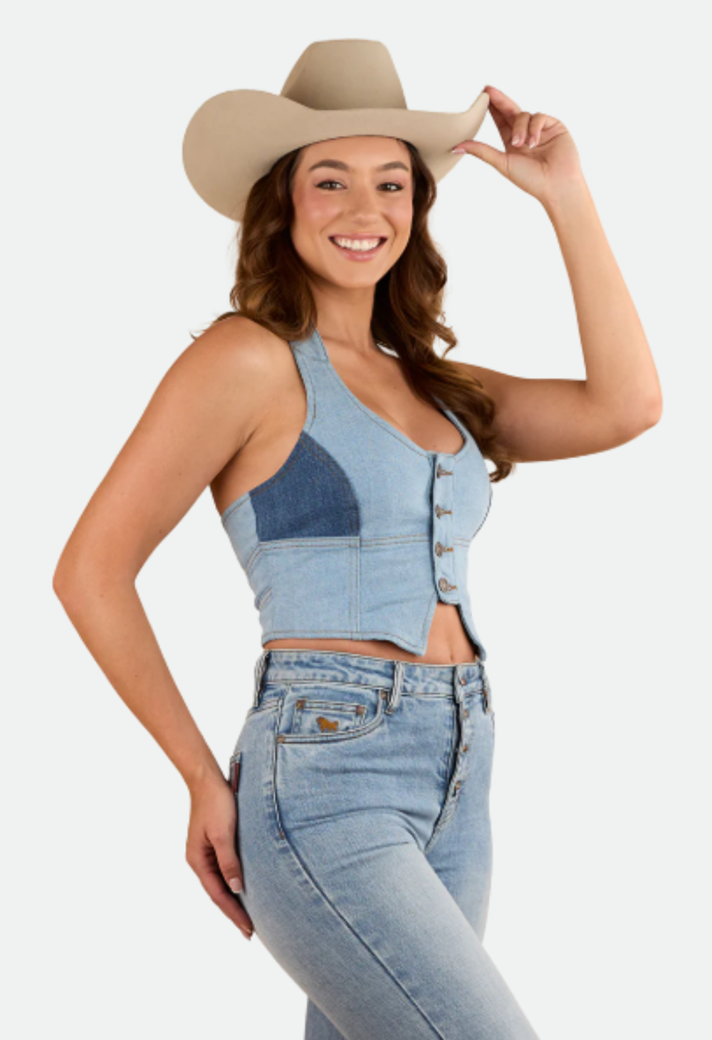 Add instant western edge to your wardrobe with the Alinta Women’s Denim Bustier. Crafted from premium colour-block denim, this fitted halterneck top flatters your shape with its contoured tuxedo hem, structured bust panels and angled seams. Finished with signature Ringers Western branding and easy front button closure, it’s perfect for festivals, nights out, or elevating your everyday denim look.