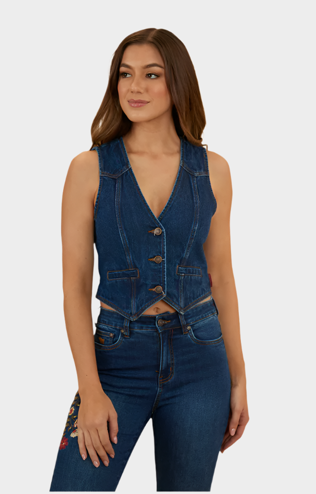 The Sutton vest is one for our denim lovers. Sutton is made from 100% rigid cotton giving that true authentic denim feel against the skin. This is a semi-fitted style, closely following the natural shape of your body creating a timeless silhouette. This vest features a centre front button closure which gives you the option to wear this vest unbuttoned over a little crop or simply as is. The Western panel accents and intricate floral embroidery details exude frontier charm with every detail. Whether you're out wrangling cattle or two-stepping at the local, our denim vest is the perfect companion for all your adventures.