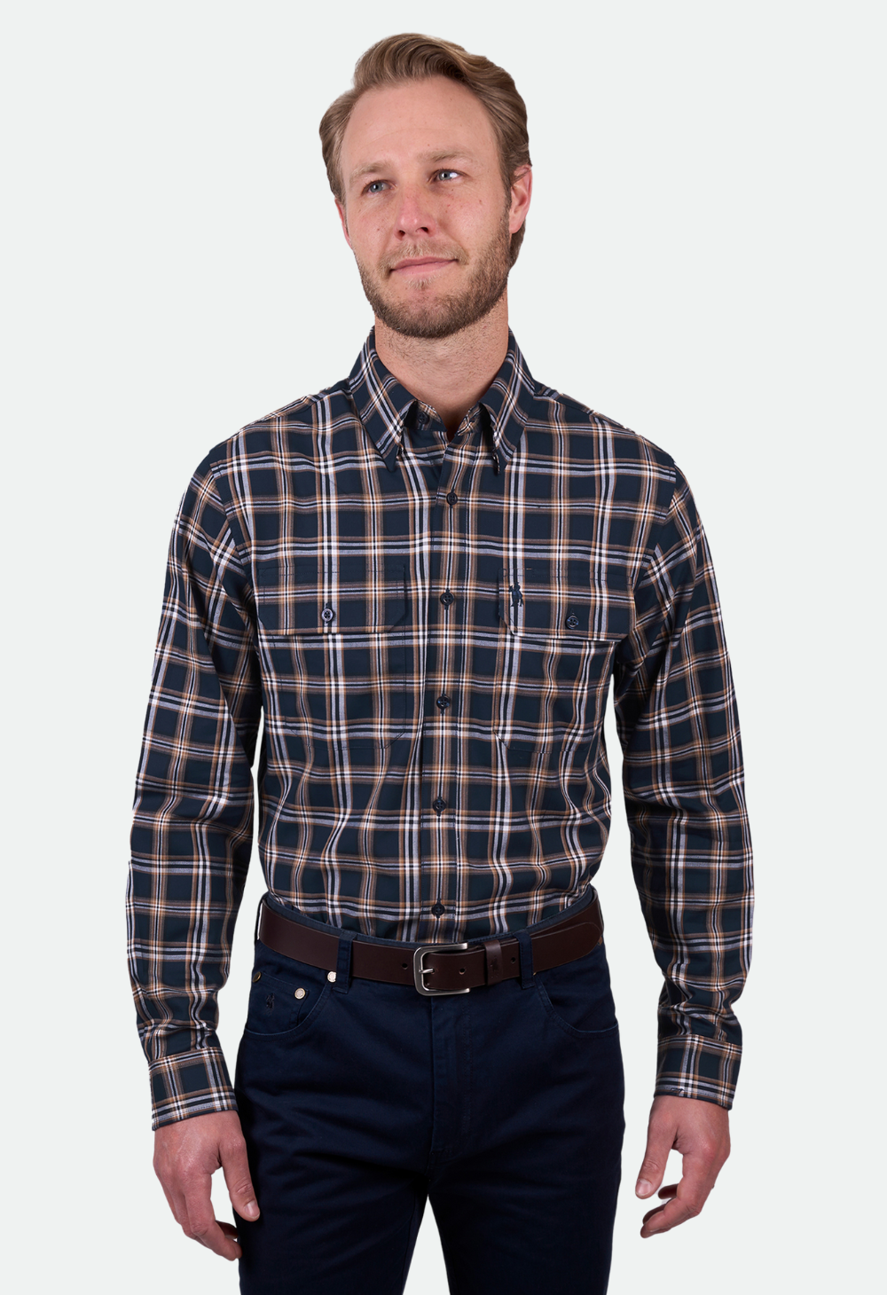 The Thomas Cook Men's Dylan 2 Pocket Long Sleeve Shirt in Navy/Tan offers a classic check pattern with a functional, laid-back style — complete with twin chest pockets and all-day comfort.