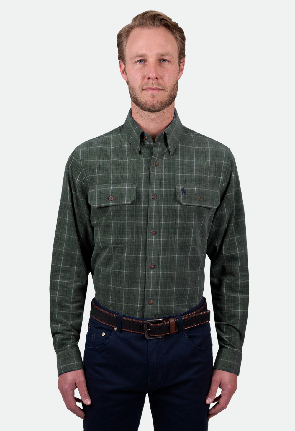 2-Pocket long sleeve shirt, onewith pen holder, pinwale cordwith thermal quality brushing,long shirt tail, back pleatfor comfort and movement,concealed collar peak buttons,removable collar stays, horsemanembroidery on chest pocket.