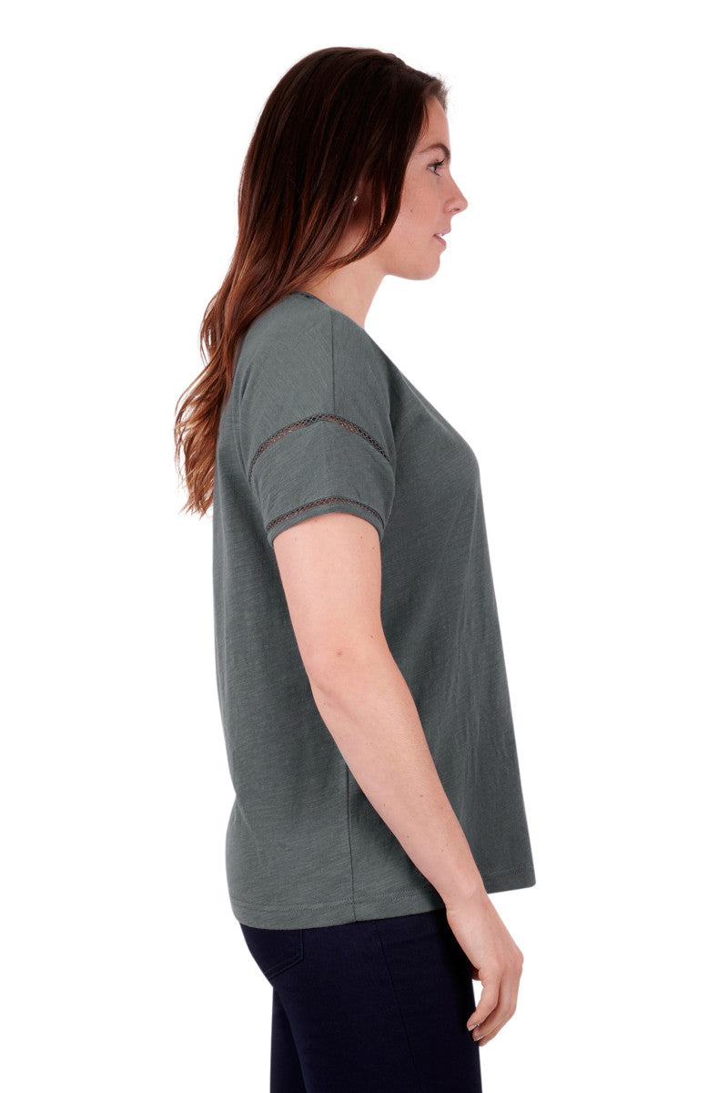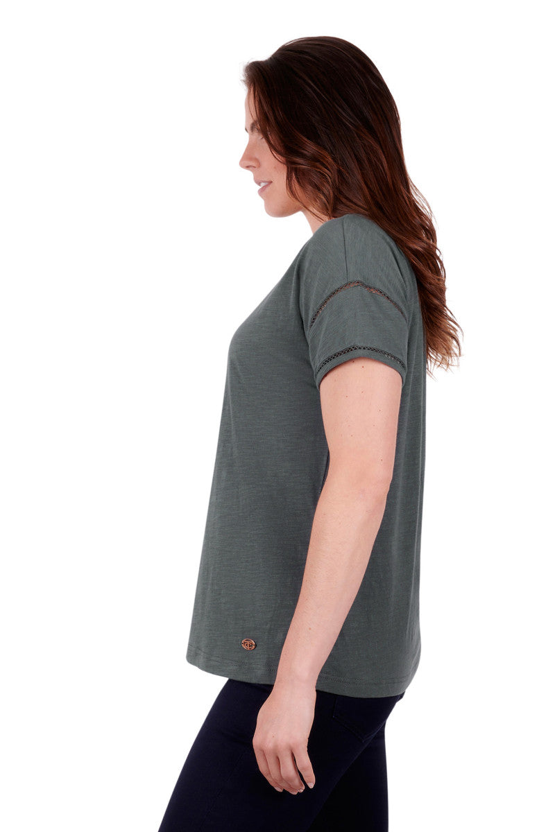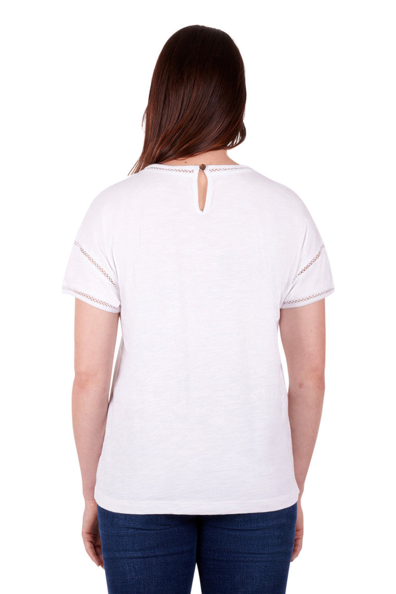 Contemporary specialty tee style in soft cotton slub jersey, Thomas Cook logo internal bind, lace trim insert around neckline, armholes and sleeve openings, keyhole opening with metal shank button at centre back neck