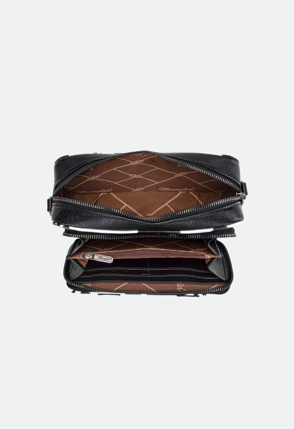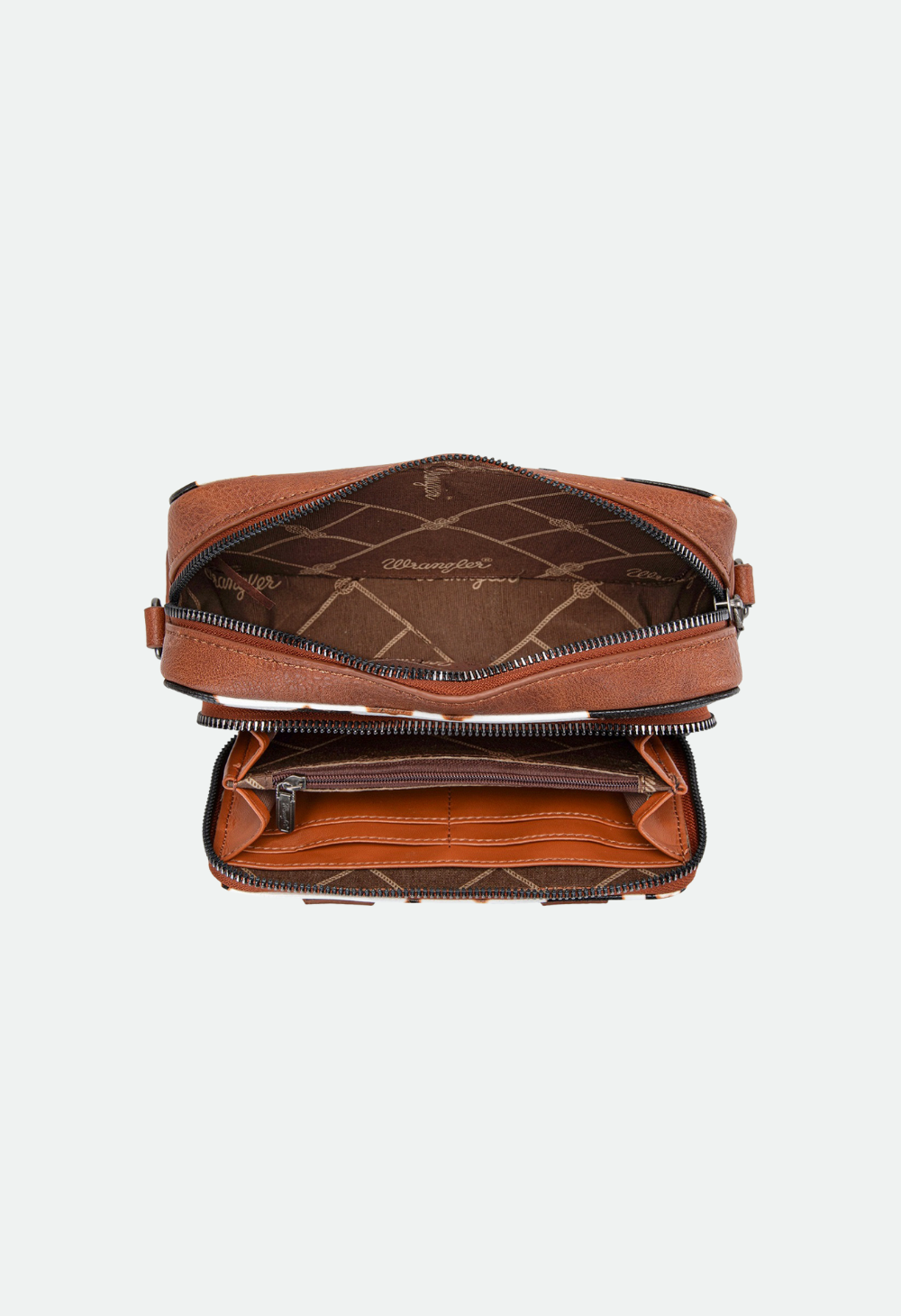 The Wrangler Cow Print Small Crossbody Bag offers a compact yet stylish design with its signature cow-print accents and secure zip closure. Lightweight and easy to carry, it’s perfect for essentials while adding a touch of Western charm to any look.