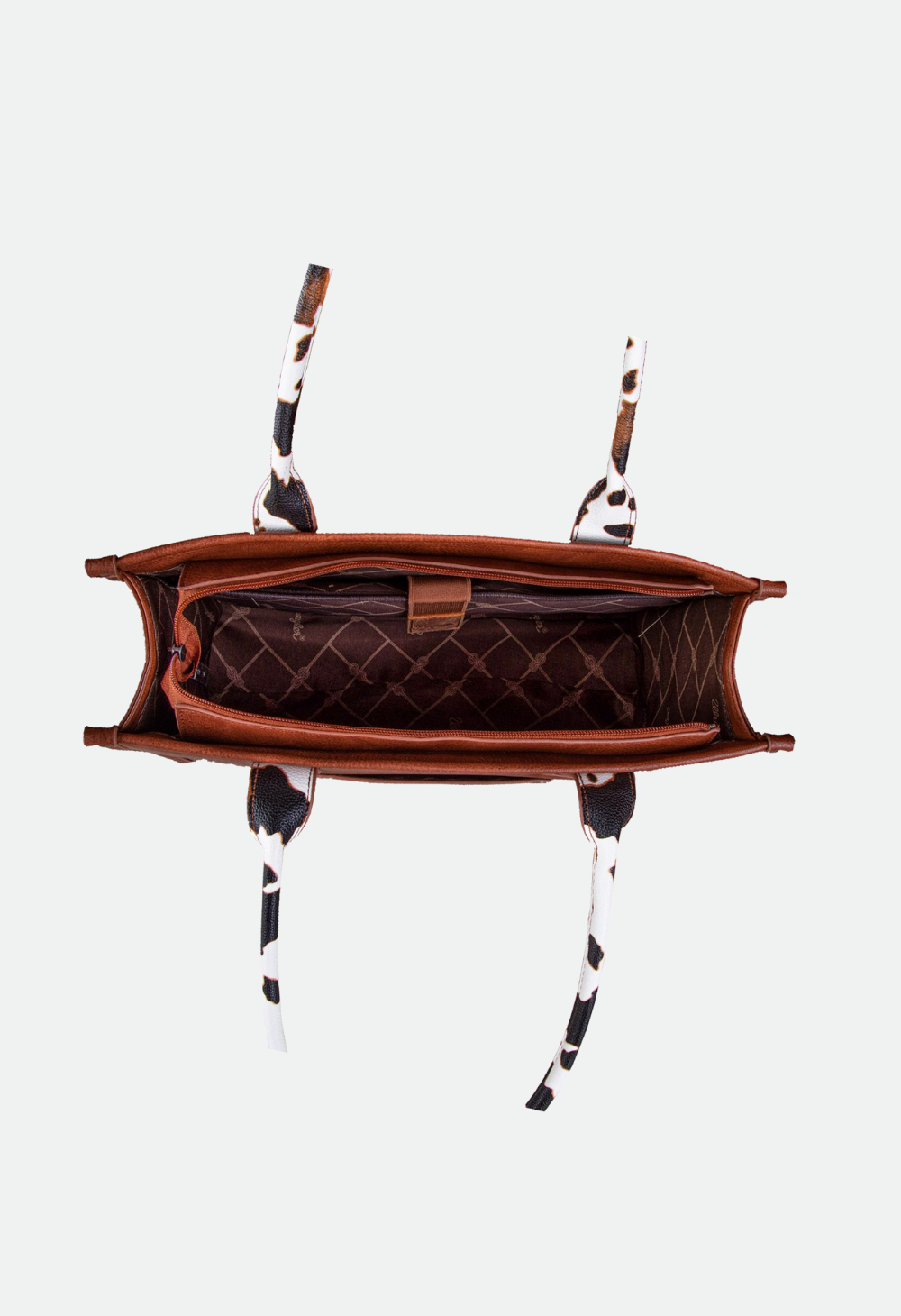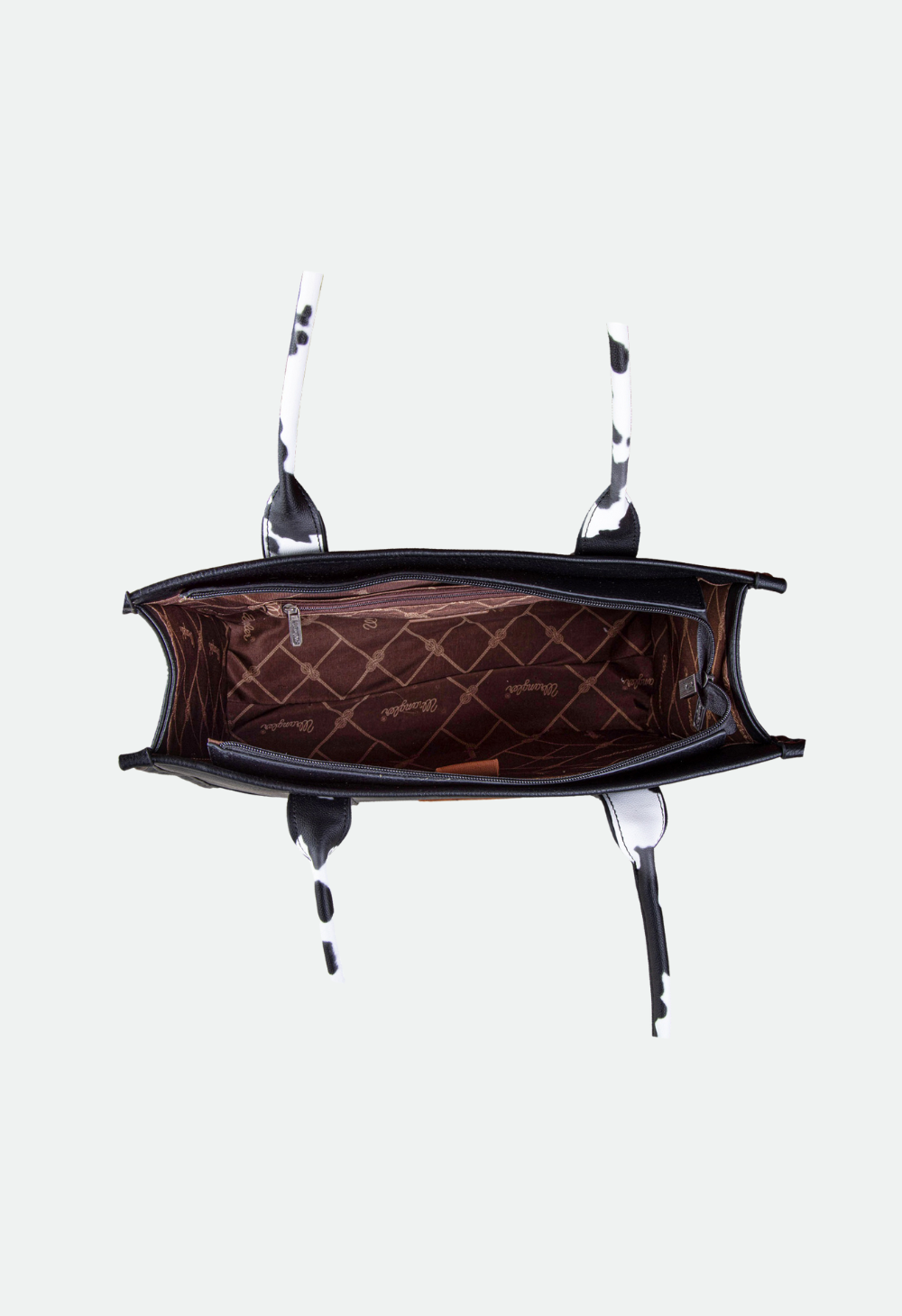 The Wrangler Cow Print Tote Bag combines a classic Western vibe with a modern, spacious design. It features durable construction, eye-catching cow-print accents, and sturdy handlesperfect for everyday use or adding a bold statement to any outfit.