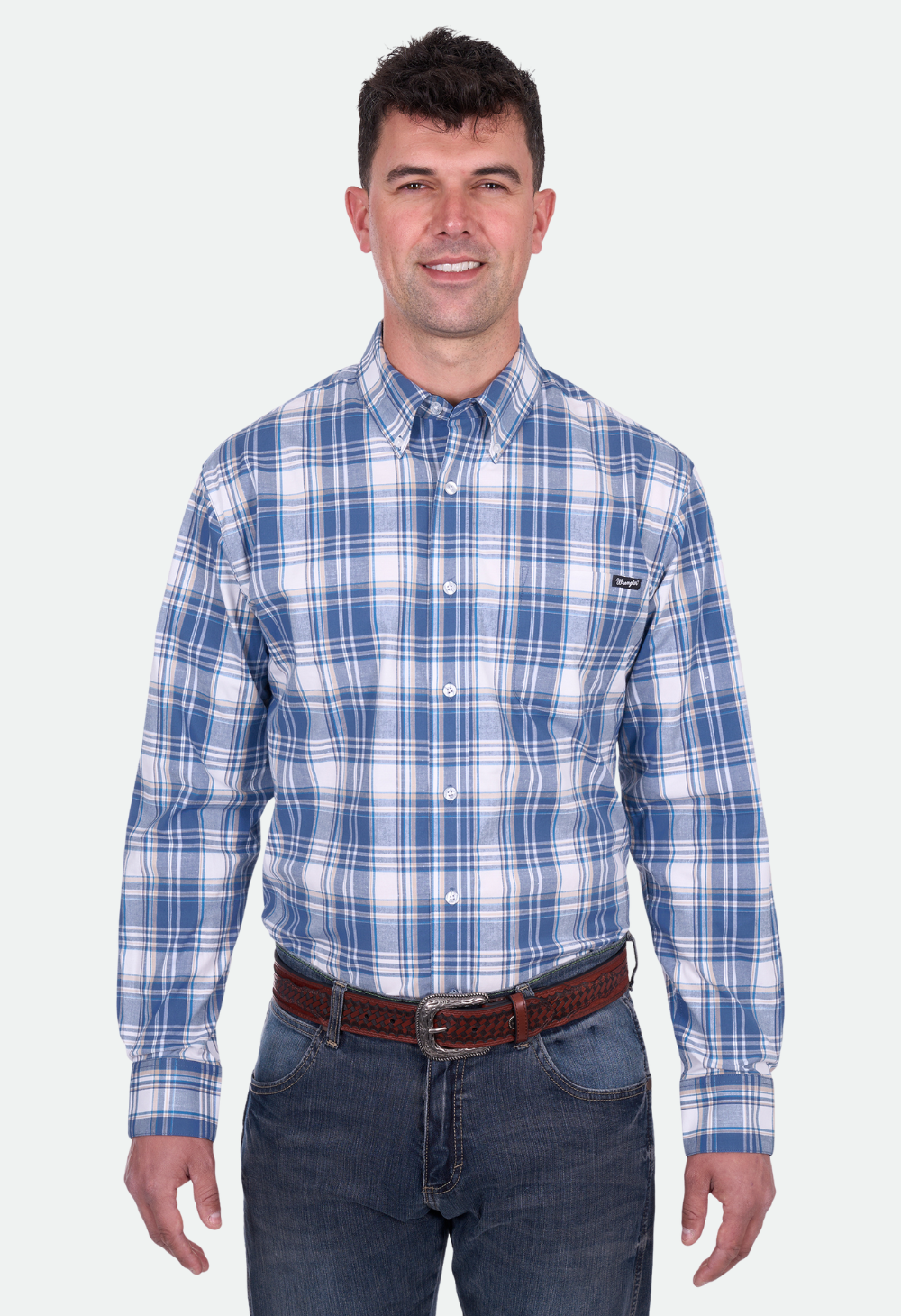 The Wrangler Men's RANGER Long Sleeve Shirt in Blue/Tan features a classic plaid design with western flair. Made from durable, comfortable fabric, it’s perfect for everyday wear, from the ranch to the weekend.