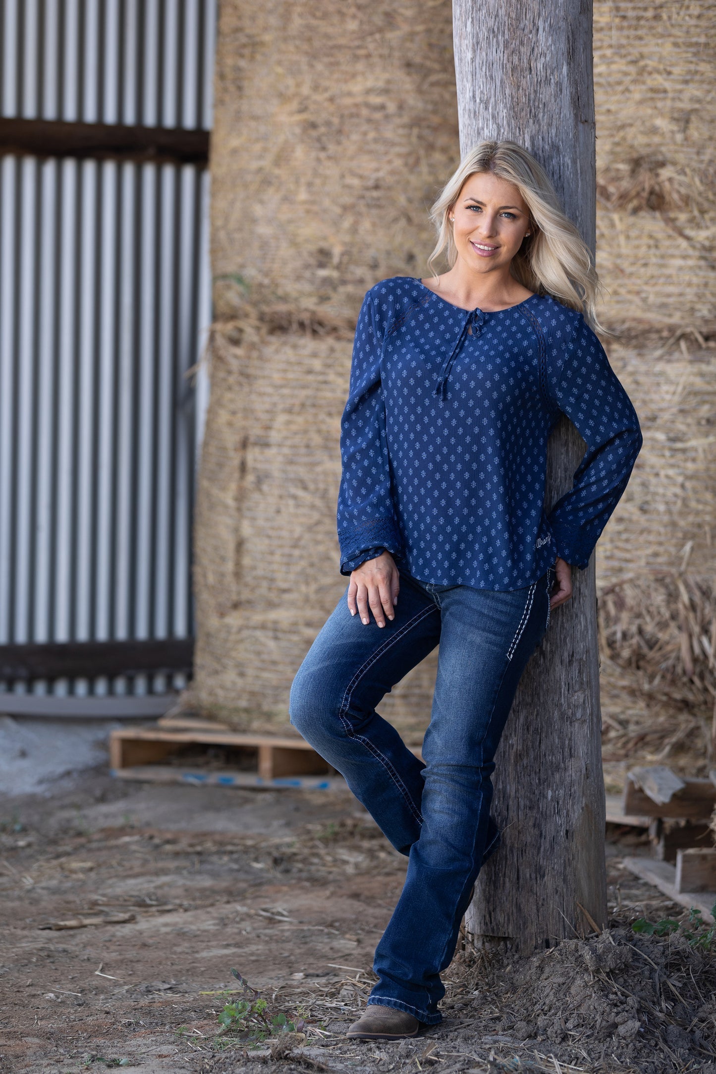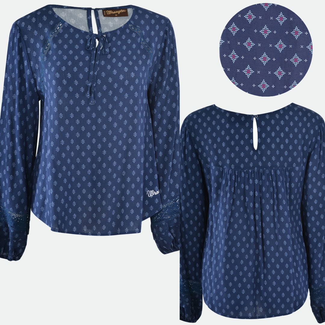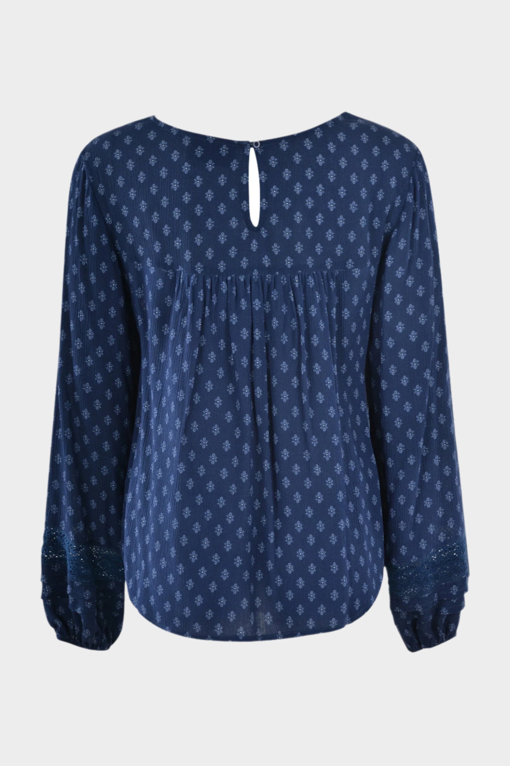 Colour: NAVYFeatures: Long sleeve boho style blouse, drapey crinkle fabric with small all over print, split neck with self tie, lace trim at front & cuffs, pin-tucking detail at sleeve cuffs, gathering at back yoke, curved hem, elasticated sleeve cuffs