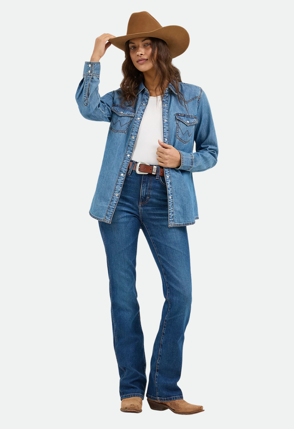 The Women’s Wrangler® Western Snap Denim Shirt delivers timeless cowgirl style with a modern edge. Made from 100% cotton denim, this classic long-sleeve snap shirt features authentic Western details—front and back yokes, pearl snaps, snap-flap chest pockets, and signature “W” stitching. Easy to dress up or down, it’s a dependable piece that brings effortless Western charm to any outfit.
